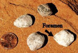 This photo shows several Composita specimens collected from a different site. Composita held itself to the sea floor by a fleshy stalk called a pedicle, which emerged from a hole in the shell called the foramen. Compare the top specimen to the photos above.